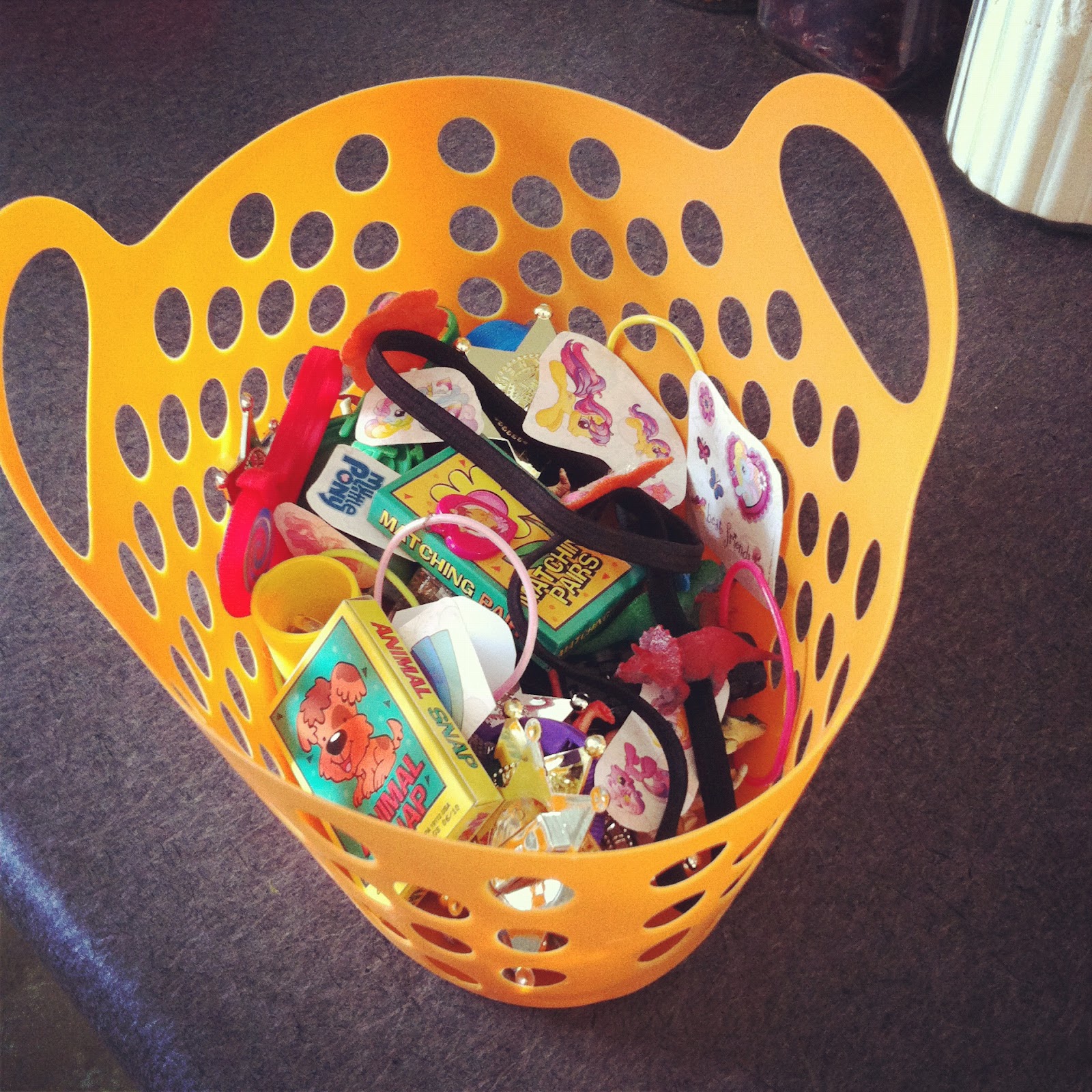 I was organizing some totes in our basement and came across all the extra grab-bag toys left over from her birthday party. Innovation/desperation struck and I dumped them into a basket. When she woke up, I showed her, cruelly watched her get so excited for them (Mom of the year award for that one) and then explained she would only get to choose one if she went pee or poo on the potty.